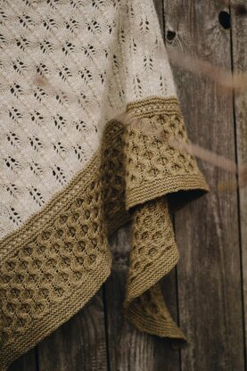 The shawl begins at the top center and is worked outwards to the border. The main section is worked in a lace stitch pattern. The cabled border is worked in the contrasting color. The instructions are written out and charted.