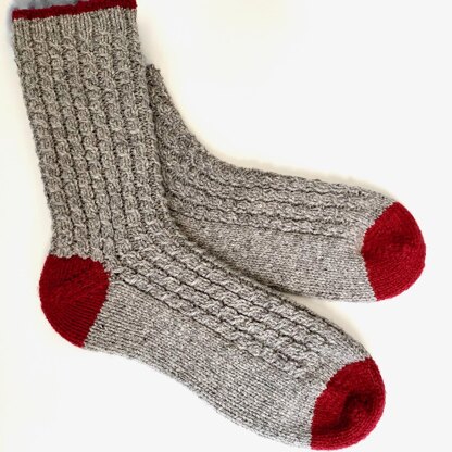 The socks are knit toe-up with contrasting color toes, afterthought heels, and a splash of color at the top of the sock. They are covered in tiny cables that twist to the left on the left sock, and to the right on the right sock.