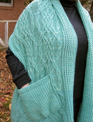 If you love knitting cables, you’ll enjoy this shawl made using worsted weight yarn, guaranteeing that you’ll be warm. The shawl incorporates a little known textured stitch with a very ornate cable that shows itself beautifully in this shawl. The pockets ensure that the shawl will stay put on your shoulders.