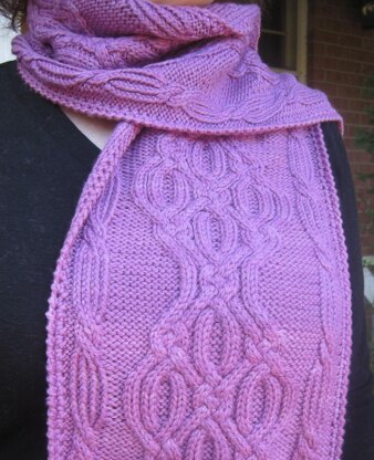 This very warm, intricately cabled scarf, contains two distinct cable stitches. The focal stitch is a show-stopper and a cable that’s rarely seen. The side cables are a bit more delicate. The two together will provide you with a unique and warm scarf.