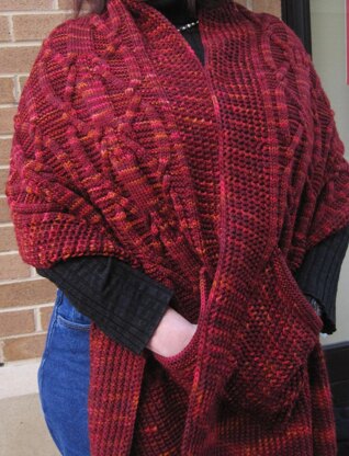 If you love knitting cables, you’ll enjoy this shawl made using worsted weight yarn, guaranteeing that you’ll be warm. The shawl incorporates a little known textured stitch with an ornate cable that shows itself beautifully in this shawl. It also lends itself to tonal variegated yarns. The pockets insure that the shawl will stay put on your shoulders.
