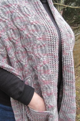 If you love knitting cables, you’ll enjoy this shawl made using worsted weight yarn, guaranteeing that you’ll be warm. The shawl incorporates a little known textured stitch with an ornate cable that shows itself beautifully in this shawl. The pockets insure that the shawl will stay put on your shoulders.