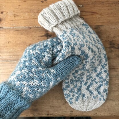The colour work is random. There is no specific chart or pattern, instead you just choose for yourself when you want to change colours and in the process create a pixellated, random effect in the fabric. No pair of mittens will be the same!