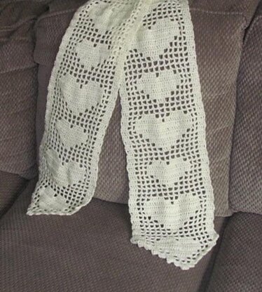 This is a scarf that is made using filet crochet. It features small and large hearts. The scarf is worked from the center out, so both ends are identical. Pattern uses written directions as well as a simple chart.