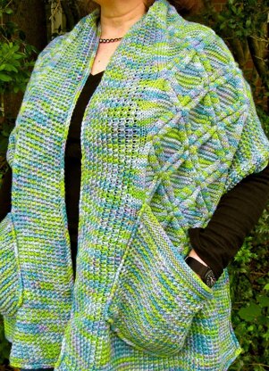 This warm pocket shawl will be both fun to knit and will keep you warm this fall. The pockets ensure that the shawl will stay on your shoulders. The ornate cable stitch as well as the little known border stitch both support variegated yarn, if you’ve got some in your stash that you’ve been wanting to use. If you love knitting cables, you’ll enjoy this pattern.