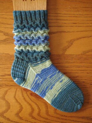 With Mom, Dad and 3 brothers a lot of times we had leftovers or “warm ups" for dinner. It was actually one of my favorite dinners, right after cereal suppers! This is an easy sock, sized for children and adults. It is knit from cuff to toe with a “slouch style" pattern. This is a great pattern for self striping yarn or even "leftovers" of yarn. When left unblocked the pattern has an “accordion" look. The adult photo shows the top unblocked and the child's sock is blocked flat so you can see the pattern.