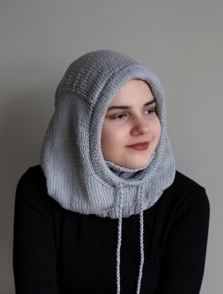 This Warmie Warmie is knit both flat and in the round. The neck part is knit in the round, the hood part is knit flat. The hood binding / drawstring tunnel is knit in the round. It is seamless.