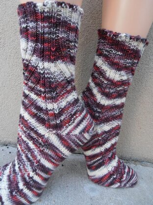This is not your basic ribbed sock. It is based in 2x2 ribbing, with 4 panels of angled ribbing. The sock is worked toe up with a short row heel.