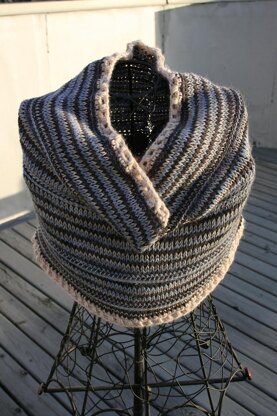 This cowl is a primer on working Tunisian crochet stranded color work (3 colors). You'll need approximately 200 yards of each of three different yarns of roughly equivalent weight, and an additional 50 - 60 yards of a final yarn for the edging that is just slightly heavier than that used for the main body. The cowl is worked flat, seamed, and then both edges are worked in the round.