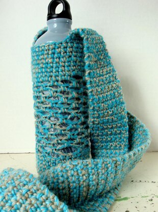 A crochet holder for your water bottle with a cross-body strap. >>If you like fun knitting content, be sure to sign up for my emails. I’m always creating new patterns and knitting-themed art to entertain you! Click on my name (found above and below this description) and then click the link in my profile.