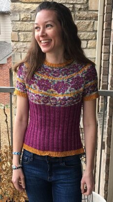This is a collaboration with Blue Mule Fiber. This beautiful yarn is so inspiring the colors reminded me of a beautiful Monet painting. This sweater is knit seamlessly top down. The yoke has a watercolor background with flower and scrolling leaf motifs. The majority of the yarn used is 75% merino wool/25% mulberry silk, so it has a beautiful shine. This short sleeve fingering weight sweater is perfect for warmer weather.