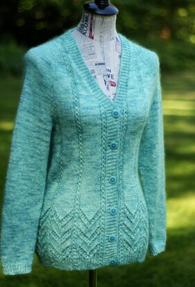 This cardigan is reminiscent of a tropical rainforest and the colour of Beloved Yarn's Magical Sport reminds me of the gorgeous waterfalls seen in Hawaii. Worked top down in one piece with raglan shaping, this cardigan features a lace pattern at the hem and fake cables trailing down the fronts and back.