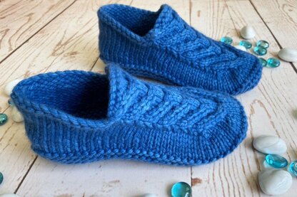 Knit all in one piece mostly in the round and finished with kitchener stitch these loafers knit up super quick. Gauge is critical and will heavily affect finished fit.