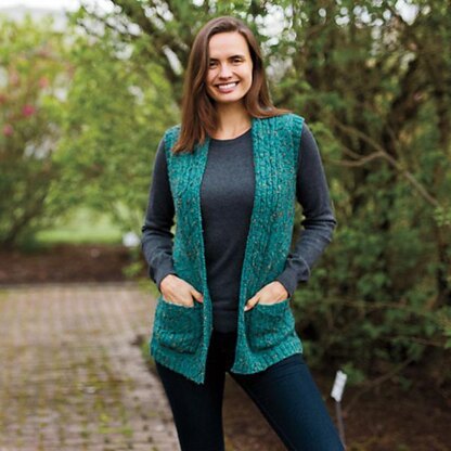 Easy 4-stitch cables are paired with a flattering basic open-front silhouette in the Waterfall Vest. Worked flat in pieces, the A-line hip length vest is worked from the bottom up, with a band of 4-stitch cables forming mirrored diagonal lines that mimic flowing water.