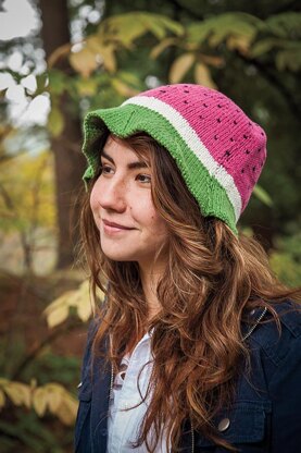 This adorable brimmed hat in watermelon colors is knitted in the rounds from bottom to top. The four sizes (extra small, small, medium and large) fits head of 16 - 22" (40.5 - 45.6 cm).