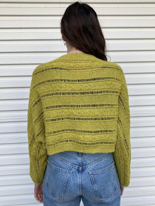 A wrap with “sleeves” , a simple combination of cables and see through lace stitch. It's very versatile, can be worn as a scarf, head scarf or poncho. Works best with a fingering weight yarn that is a bit silky and shows off the detail in the structure. 300 grams of 4 ply yarn is required. The pattern comes in a chart and row by row written form.