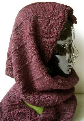 This lacy head scarf is both elegant and easy if you are familiar with these simple lace stitches: yo, k2tog, ssk. The scarf is worked in one piece, starting at the bottom of one side, increasing for the “hood”, then decreasing back down to other end. Worked flat without seams. I recommend either a sport or worsted wt. but I have also knit this in my handspun which is between a fingering and a sport. The changes will affect the width of the piece.