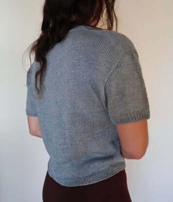 The Waves Tee is a classic stockinette t-shirt with a boxy look, featuring 1x1 ribbing hems and collar designed to stand out. It has a fairly classic fit with a 10 cm (4”) positive ease at the bust and regular armhole depth. The body length can be customized from regular to your preferred length.