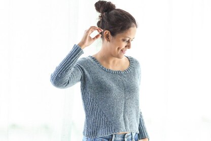 Wavetable is a drop shoulder pullover worked bottom up and in the round to the underarms. A small section of the body and sleeves is worked in twisted rib, with a purl band separating the Stocking stitch from the ribbed stitches. For the body, the number of twisted stitches keeps decreasing as the work progresses towards the armhole, forming a triangle of twisted stitches and motifs. For the sleeve, the number of twisted stitches keeps increasing towards the sleeve cuff.