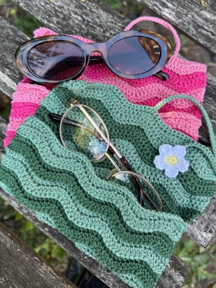 This pattern shows how to make this cute glasses case with flower fastening! It includes how to work a ridged chevron stitch, how to form the glasses case, and how to make the flower charm fastening. This would also make a really good pouch for your hooks and notions, or a cute wrap for brushes, pencils, or artist materials.