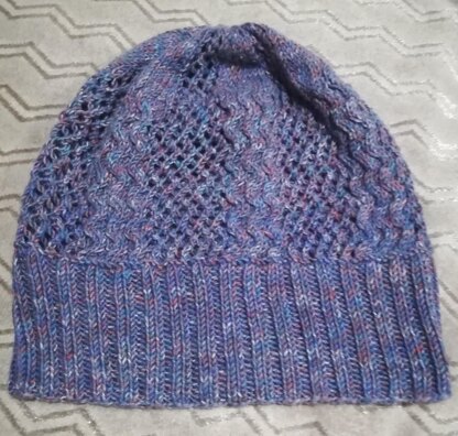 Wavy Lines Hat This is a remarkably simple yet pretty hat which involves only very basic repeating cable & lace stitch patterning, so that even an adventurous beginner who now wants to master more advanced knitting techniques could be encouraged to turn their hand to it, or for the more experienced knitter it offers enough interest without being too challenging. I have styled it as quite a slouchy hat, but this can be adjusted as you will see below under Finished measurements. The matching Cowl is also available. Requires approx. 252yards / 231 metres DK weight yarn The yarn usage amount is an approximate guide