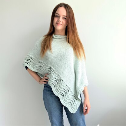 Wavy Sea is a flowing poncho, with a scalloped lacy edge that is remiscent of the waves on the sea shore. Knitted in aran/worsted yarn, it is a lighter knit for Spring/Autumn days, or brilliant for cooler, Summer evenings. Great with jeans or a flowy skirt.