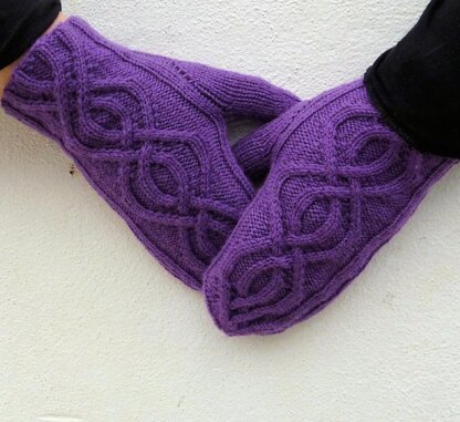 The Wayfarer Mittens feature a travelling cable panel which travels up the hand. Choose between mittens and fingerless mitts.