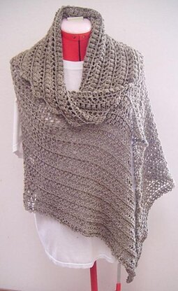 It is crocheted from bottom to top, asymmetrical, trapezium wrap. Increases were made at both ends and are staggered. It can be worn in different ways; turn it 180 or as a poncho. Sizes are 34” to 36”, 38” to 40” and 42” to 44”. Any yarn will be great as long as the wrap turns out drapey. Any colours will be great too.
