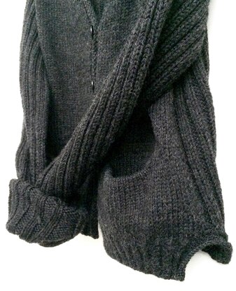 Wearable is a worsted weight cardigan, knitted in Cascade 220 in colour charcoal. It is a seamless, top down construction with a V-neck, raglan yoke shaping, ribbed back and sleeves, stockinette front and cute pockets. The body has a twist stitch side seam and a twist stitch rib for the front band. The band for the back and sleeves is a simple extension of the 2x2 rib.