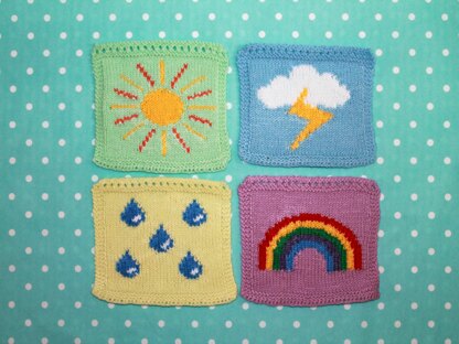 This is a set of intarsia charts for a collection of weather symbols - sunshine, lightening cloud, raindrops and a rainbow. Great for a child's bedroom décor, or anyone who enjoys fun and colourful designs!