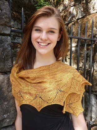 Inspired by a stitch pattern and a yarn, the Webfoot Scarf and Shawls are perfectly at home at an Oregon Ducks football game. Golden diamonds of moss stitch resemble duck feet, and O’s are slyly interspersed between the diamonds. The scarf and shawls all begin with the same border; the difference is in the crescent shaping that is created with simple short rows. The scarf is a very wide, shallow crescent, and is best worn bandana-style. The shawls have more depth at the center back, and a deeper curve. Each piece requires just one 400 yard skein of fingering weight yarn.