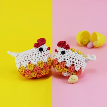 These wee little hens are the perfect size for hiding away small treats for an Easter egg hunt! There are two styles of granny squares and two ways to finish the amigurumi. It can be made either as a stuff toy or a plastic surprise egg holder, it can even hold a foil-wrapped chocolate egg about chicken egg size.