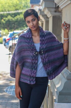 Stylish and modern in design, the Weekend Cocoon Jacket is stunningly simple to construct. Worked in a textured stitch pattern of knit and purl stitches, three rectangles are seamed together to create the cape/jacket. The wide braided cables along the front/neck opening add dramatic dimension and set the stage to show off your favourite closure (model shown using Mod Loop Leather Closure from Jul Designs).