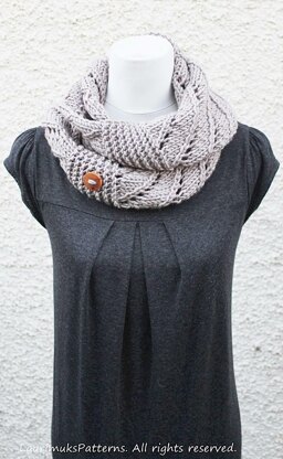 Weekender infinity scarf is composed of alternating bands of diagonal lace and garter stitch with added button for appeal.