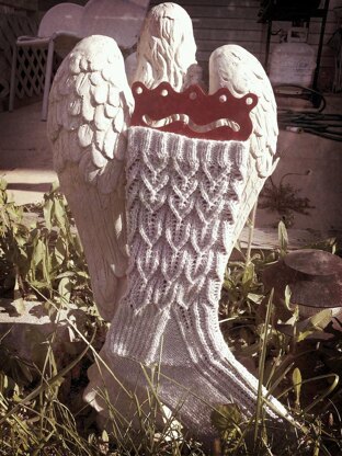 "Weeping Angel" is a lace sock, knit from the top down to emulate the wings of stone angels. I am providing it in one size, but it can be shrunk or enlarged by altering gauge. This sock fits my ladies' size 9.5 feet (average width) snugly, but has cling and stretch due to the lace pattern. Rather small-footed folks may wish to go down a needle size or two and use finer yarn.