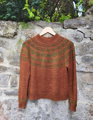 This sweater was inspired by the beautiful autumn in Weimar. The colorwork has floral motives which reflect the beauty of autumnal nature and is at the same time subtle and elegant. This piece is knitted seamlessly top-down, with a circular yoke. It is designed to be fitted at the top and then it has a boxy shape at the waist.