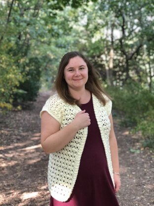 This cap-sleeved cardigan is the perfect transition piece! It has a gorgeous layered lace pattern with lots of texture. The overlapping stitches manage to make it both lacy and squishy, so it’s really cozy! The Wellspring Cardigan is perfect for layering over a dress, but also looks great with jeans/jean shorts or leggings. Dress it up or down!