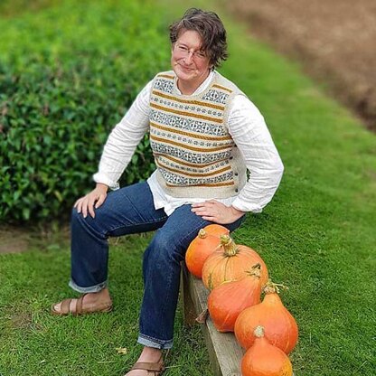 The Wensum vest features a stranded colourwork design on the front. The back is knitted plain. Colourwork can be repeated on the back if desired. Button band fastening to the sides gives a tabbard twist to the vest. The fronts & backs are knitted flat bottom up. The button band stitches are set aside whilst the fronts and backs are worked. The stitches are then picked up from the ribbed hem & knitted separately up to the armholes. The bands are sewn into place before the stitches are incorporated into the armbands to finish.