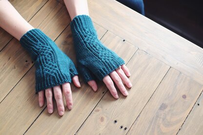 Fingerless mitts: Approximately 125 (150, 170) yds / 114 (137, 155) m YOTH Yarns Big Sister (80% Merino wool / 10% cashmere / 10% nylon, 231 yds / 211 m per 100 g skein) 1 skein. Shown in Thyme.