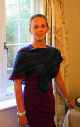The construction of this shawl makes a crescent shape that sits comfortably around the shoulders without the need of a shawl pin to keep it in place.