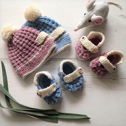Westlake is a baby hat and bootie set knitted in the round. With a garter stitch brim and contrasting colour to set off the pom pom, the hat is worked up super fast with a little strap added to tie the set together. The booties start off flat with their garter stitch sole and picked up stitches around the edge create the rest of the boot in the round. The final strap is added and sewn on along with a cute little button.
