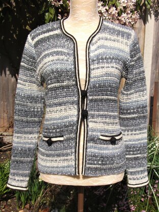 This is smart little design inspired by the timeless look of Chanel’s famous little jackets. I called this design “Westminster” mainly because of the lovely muted shading of this particular yarn, reflecting the hues of the Palace of Westminster. The main stitch used is a simple 2 row broken rib pattern, with striped garter stitch curved borders. So fairly simple knitting but achieving a striking look.
