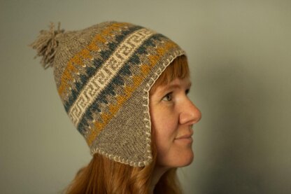 This hat begins with making a couple of earflaps, which are then united to the rest of the cast on for the brim. A simple Fair Isle pattern makes a bold geometric statement across the body of the hat and then the crown is worked with a slightly peaked shaped. A small amount of crochet is used to reinforce the brim and earflaps and then decorated with a blanket stitch. This hat can be further adorned with a pom pom or tassel for a little whimsy!