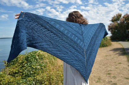 Rocky shores, lush rainforest, grassy fields, tall peaks, ocean waves & urban skylines. This shawl uses motifs inspired by the tradition of far off island of Guernsey Island, to share stories of life on Vancouver Island, in the Pacific Northwest Coast of Canada. Keep warm during the change in weather, cool ocean breezes, & rain with this generously sized worsted weight shawl.