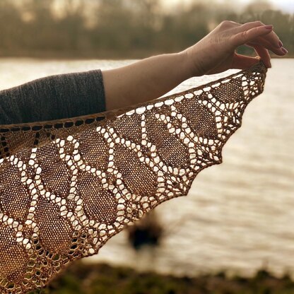 The shawl uses 1 skein of 100g 4ply, sock or fingering-weight yarn. The sample shawl was worked in Under the Olive Tree Knits Steni Vala 4ply yarn, a lustrous and velvety blend of merino and silk.