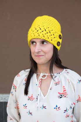Hat is worked from the bottom up seamlessly and continuously in one piece – first the band is worked flat from side to side, then folded to overlap for the buttons, then stitches are worked into the spaces on the side of the band to start forming of the crown and work continues in the round in spiral.