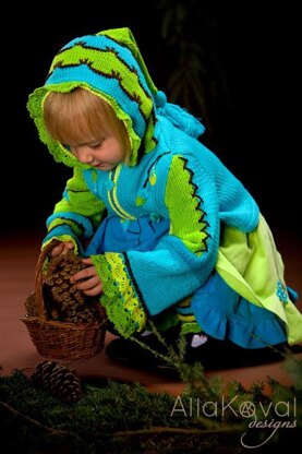 No matter what is on your schedule - a trip, a party, shopping or just a walk in the park - your little princess will sure attract attention in this pretty and stylish jacket. This jacket can be made in any theme and color combination and features ruffles on side of body, sleeves and around hood, an owl pocket on the right front, bell sleeves made with fancy stripes pattern, and hand vine embroidery with crocheted tiny leaves and delicate velvet flowers appliqued for more festive look.