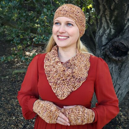 The Whimsy Set is a three-piece set of matching hand warmers, cowl, + hat knit in a one-color brioche design.