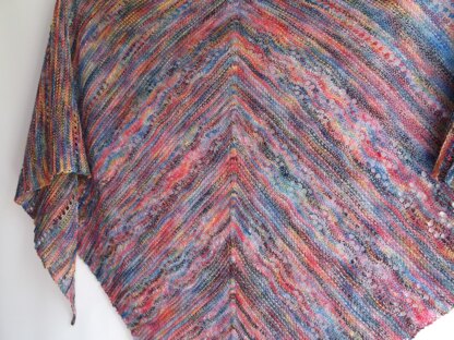 This pretty shawl is worked bottom up and outwards. After constructing a centre square which has a simple lace pattern amongst garter stitch. The right and left wings are worked from either side of the square. These have a row of intermmitent eyelets
