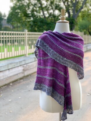 Two color crescent shawl knit in garter stitch with yarnover breaks in a contrast color. Finished using the contrast color a knit-on edge is added with a leafy lace motif. Three sizes to knit to your preferred fit.